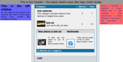 So far, we have come up with placeholders for the mandatory placeholder tokens - now let's take a look at the style sheet (CSS). In our little example, it's quite easy to integrate the CSS that comes with the overall design into coppermine's style, as there are only a few definitions, and for ease of use they even reside embedded into the template file (inline styles). While that's a good idea for a small demonstration to make the code readable, it's usually mandatory to keep the styles in an external stylesheet file. That's why coppermine does as well. In each theme, there is a file named "style.css" that contains all CSS. This is the case for the theme as well that we used to build our custom theme upon. Therefore, open another window of your editor and in that window edit themes/my_theme/style.css. Leave that window open - we'll need it for a while.